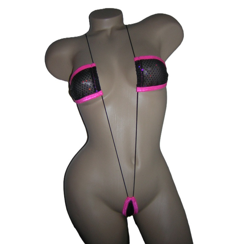 Sexy one-piece glitter mesh exotic dancer monokini slingshot. Features micro triangle top connected to a teardrop bottom, suspenders style and attached to stretchy elastic cord. Turn heads with the Glitter Mesh Maya Slingshot — a daring, sculpted silhouette designed to shimmer with every move. Crafted from soft, stretch mesh infused with fine glitter, this piece blends comfort with high‑impact shine. The sexy cut, minimal coverage, and sleek straps create a statement look perfect for festivals, photoshoots, bikini competition, exotic wear, stripper wear, exotic dancewear, tanning, or nights out when you want all eyes on you. Lightweight, breathable, and unapologetically bold.